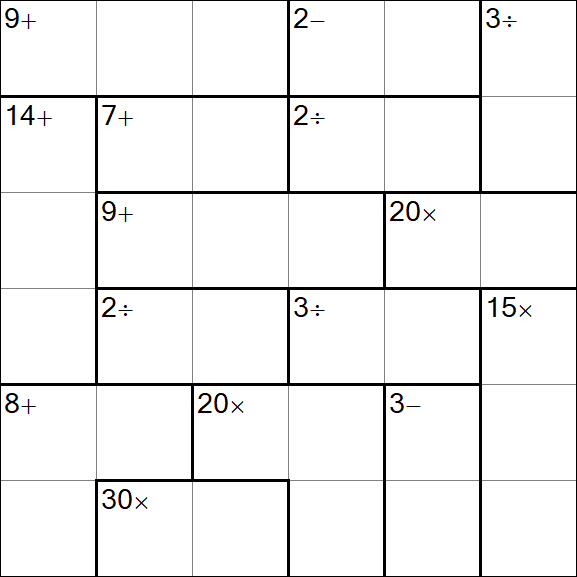 - Each bold-outlined group of cells (block) contains digits that achieve the specified result using the specified mathematical operation: addition (+), subtraction (-), multiplication (×), and division (÷).