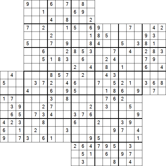 Kazaguruma, also known as Windmill Sudoku, is a captivating variant of the classic Sudoku puzzle. It features five interlinked Sudoku grids, with one central grid and four additional grids that overlap the central one. The unique layout forms a pattern resembling a windmill, providing an intricate and challenging puzzle-solving experience.