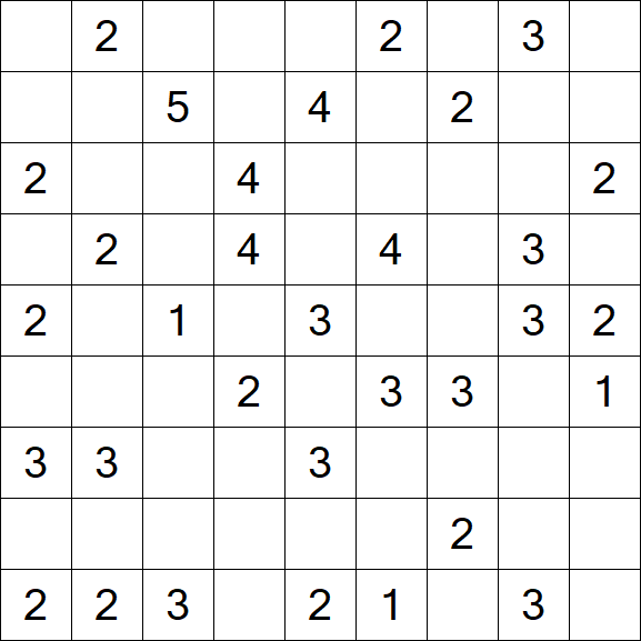 Minesweeper is a well-known logic puzzle played on a square grid. The task in Minesweeper is to place mines into empty cells within this grid. The grid may contain numbers in certain cells, which indicate how many mines are located in the surrounding cells, including those that are diagonally adjacent. The challenge is to deduce the locations of the mines based on the numbers given and place them in such a way that each number corresponds correctly to the mines in its neighboring cells.