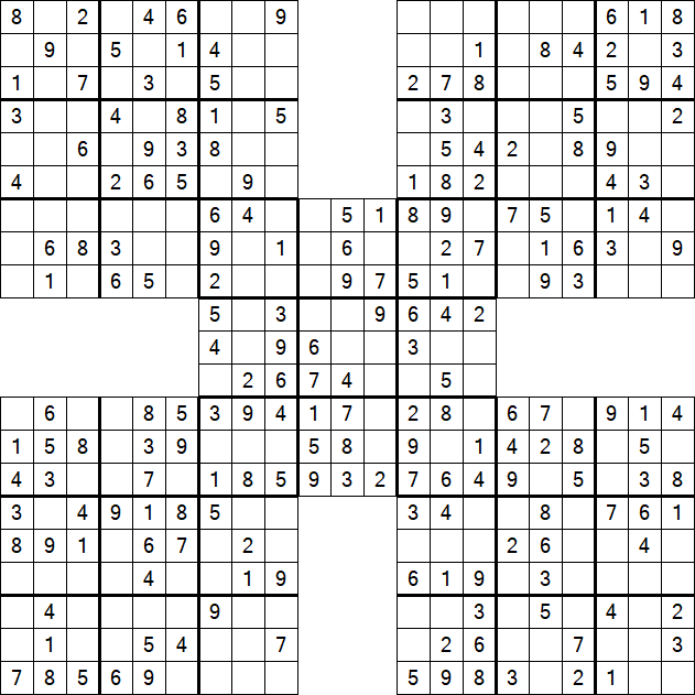 - Estrutura da Grade: O quebra-cabeça consiste em cinco grades de 9x9, com a grade central sendo sobreposta pelas outras quatro nos cantos.